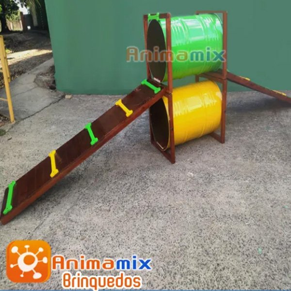 Este conjunto é composto por três tambores coloridos, montados em estruturas de madeira resistentes, projetados especialmente para estimular a atividade física, curiosidade e diversão dos cães.