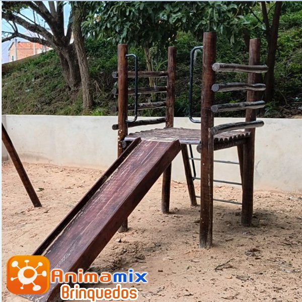 Playground com bases de sustentação em madeira de eucalipto autoclavado, plataforma e rampa em madeira de maçaranduba, partes ferrosas galvanizadas e com pintura epóxi, escorregador em fibra de 2,00mt.